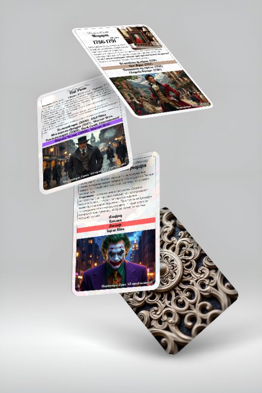 Колода содержит 15 комплектов, каждый состоит из 4х карт. Всего 60 карт. Каждый полный комплект - это сундучок, имеет одинаковый заголовок наверху карты. Разница между картами сундучка - на каждой карте выделена одна из четырех позиций.